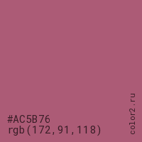 Цвет #AC5B76 в цветовой модели RGB обозначается тремя октетами (172, 91, 118) в десятичном формате и #AC5B76 в шестнадцатиричном (hex) формате, которые являются интенсивностью красного 172 (hex AC), интенсивность зелёного 91 (hex 5B) и интенсивность синего 118 (hex 76).