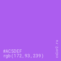 Цвет #AC5DEF в цветовой модели RGB обозначается тремя октетами (172, 93, 239) в десятичном формате и #AC5DEF в шестнадцатиричном (hex) формате, которые являются интенсивностью красного 172 (hex AC), интенсивность зелёного 93 (hex 5D) и интенсивность синего 239 (hex EF).