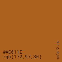 Цвет #AC611E в цветовой модели RGB обозначается тремя октетами (172, 97, 30) в десятичном формате и #AC611E в шестнадцатиричном (hex) формате, которые являются интенсивностью красного 172 (hex AC), интенсивность зелёного 97 (hex 61) и интенсивность синего 30 (hex 1E).