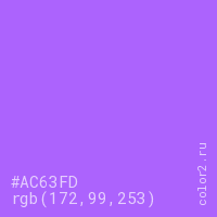 Цвет #AC63FD в цветовой модели RGB обозначается тремя октетами (172, 99, 253) в десятичном формате и #AC63FD в шестнадцатиричном (hex) формате, которые являются интенсивностью красного 172 (hex AC), интенсивность зелёного 99 (hex 63) и интенсивность синего 253 (hex FD).