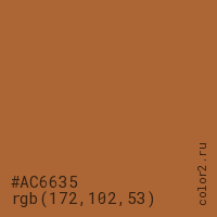 Цвет #AC6635 в цветовой модели RGB обозначается тремя октетами (172, 102, 53) в десятичном формате и #AC6635 в шестнадцатиричном (hex) формате, которые являются интенсивностью красного 172 (hex AC), интенсивность зелёного 102 (hex 66) и интенсивность синего 53 (hex 35).