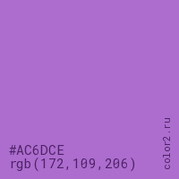 Цвет #AC6DCE в цветовой модели RGB обозначается тремя октетами (172, 109, 206) в десятичном формате и #AC6DCE в шестнадцатиричном (hex) формате, которые являются интенсивностью красного 172 (hex AC), интенсивность зелёного 109 (hex 6D) и интенсивность синего 206 (hex CE).