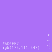 Цвет #AC6FF7 в цветовой модели RGB обозначается тремя октетами (172, 111, 247) в десятичном формате и #AC6FF7 в шестнадцатиричном (hex) формате, которые являются интенсивностью красного 172 (hex AC), интенсивность зелёного 111 (hex 6F) и интенсивность синего 247 (hex F7).