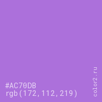 Цвет RGB(172, 112, 219) в процентом отношении количества цвета состоит из 67.5% красного (red), 43.9% зелёного (green) и 85.9% синего (blue).