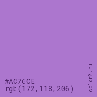 Цвет #AC76CE в цветовой модели RGB обозначается тремя октетами (172, 118, 206) в десятичном формате и #AC76CE в шестнадцатиричном (hex) формате, которые являются интенсивностью красного 172 (hex AC), интенсивность зелёного 118 (hex 76) и интенсивность синего 206 (hex CE).
