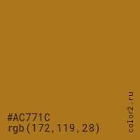 Цвет #AC771C в цветовой модели RGB обозначается тремя октетами (172, 119, 28) в десятичном формате и #AC771C в шестнадцатиричном (hex) формате, которые являются интенсивностью красного 172 (hex AC), интенсивность зелёного 119 (hex 77) и интенсивность синего 28 (hex 1C).