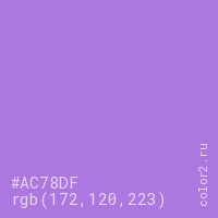 Цвет #AC78DF в цветовой модели RGB обозначается тремя октетами (172, 120, 223) в десятичном формате и #AC78DF в шестнадцатиричном (hex) формате, которые являются интенсивностью красного 172 (hex AC), интенсивность зелёного 120 (hex 78) и интенсивность синего 223 (hex DF).