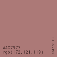 Цвет #AC7977 в цветовой модели RGB обозначается тремя октетами (172, 121, 119) в десятичном формате и #AC7977 в шестнадцатиричном (hex) формате, которые являются интенсивностью красного 172 (hex AC), интенсивность зелёного 121 (hex 79) и интенсивность синего 119 (hex 77).