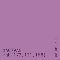 Цвет #AC79A8 в цветовой модели RGB обозначается тремя октетами (172, 121, 168) в десятичном формате и #AC79A8 в шестнадцатиричном (hex) формате, которые являются интенсивностью красного 172 (hex AC), интенсивность зелёного 121 (hex 79) и интенсивность синего 168 (hex A8).