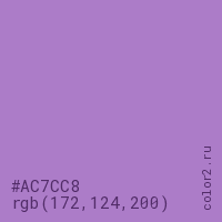Цвет #AC7CC8 в цветовой модели RGB обозначается тремя октетами (172, 124, 200) в десятичном формате и #AC7CC8 в шестнадцатиричном (hex) формате, которые являются интенсивностью красного 172 (hex AC), интенсивность зелёного 124 (hex 7C) и интенсивность синего 200 (hex C8).