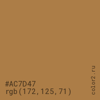 Цвет #AC7D47 в цветовой модели RGB обозначается тремя октетами (172, 125, 71) в десятичном формате и #AC7D47 в шестнадцатиричном (hex) формате, которые являются интенсивностью красного 172 (hex AC), интенсивность зелёного 125 (hex 7D) и интенсивность синего 71 (hex 47).