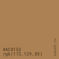 Цвет #AC8153 в цветовой модели RGB обозначается тремя октетами (172, 129, 83) в десятичном формате и #AC8153 в шестнадцатиричном (hex) формате, которые являются интенсивностью красного 172 (hex AC), интенсивность зелёного 129 (hex 81) и интенсивность синего 83 (hex 53).