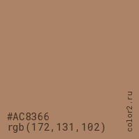 Цвет #AC8366 в цветовой модели RGB обозначается тремя октетами (172, 131, 102) в десятичном формате и #AC8366 в шестнадцатиричном (hex) формате, которые являются интенсивностью красного 172 (hex AC), интенсивность зелёного 131 (hex 83) и интенсивность синего 102 (hex 66).