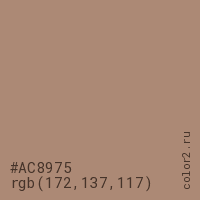Цвет #AC8975 в цветовой модели RGB обозначается тремя октетами (172, 137, 117) в десятичном формате и #AC8975 в шестнадцатиричном (hex) формате, которые являются интенсивностью красного 172 (hex AC), интенсивность зелёного 137 (hex 89) и интенсивность синего 117 (hex 75).