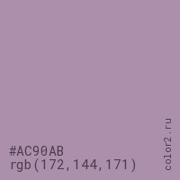 Цвет #AC90AB в цветовой модели RGB обозначается тремя октетами (172, 144, 171) в десятичном формате и #AC90AB в шестнадцатиричном (hex) формате, которые являются интенсивностью красного 172 (hex AC), интенсивность зелёного 144 (hex 90) и интенсивность синего 171 (hex AB).