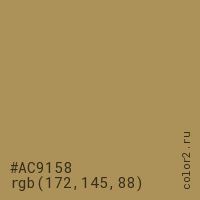 Цвет #AC9158 в цветовой модели RGB обозначается тремя октетами (172, 145, 88) в десятичном формате и #AC9158 в шестнадцатиричном (hex) формате, которые являются интенсивностью красного 172 (hex AC), интенсивность зелёного 145 (hex 91) и интенсивность синего 88 (hex 58).