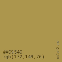 Цвет #AC954C в цветовой модели RGB обозначается тремя октетами (172, 149, 76) в десятичном формате и #AC954C в шестнадцатиричном (hex) формате, которые являются интенсивностью красного 172 (hex AC), интенсивность зелёного 149 (hex 95) и интенсивность синего 76 (hex 4C).