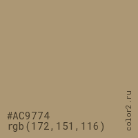 Цвет #AC9774 в цветовой модели RGB обозначается тремя октетами (172, 151, 116) в десятичном формате и #AC9774 в шестнадцатиричном (hex) формате, которые являются интенсивностью красного 172 (hex AC), интенсивность зелёного 151 (hex 97) и интенсивность синего 116 (hex 74).