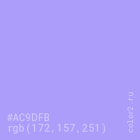 Цвет #AC9DFB в цветовой модели RGB обозначается тремя октетами (172, 157, 251) в десятичном формате и #AC9DFB в шестнадцатиричном (hex) формате, которые являются интенсивностью красного 172 (hex AC), интенсивность зелёного 157 (hex 9D) и интенсивность синего 251 (hex FB).