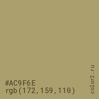 Цвет #AC9F6E в цветовой модели RGB обозначается тремя октетами (172, 159, 110) в десятичном формате и #AC9F6E в шестнадцатиричном (hex) формате, которые являются интенсивностью красного 172 (hex AC), интенсивность зелёного 159 (hex 9F) и интенсивность синего 110 (hex 6E).