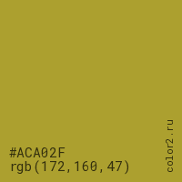 Цвет #ACA02F в цветовой модели RGB обозначается тремя октетами (172, 160, 47) в десятичном формате и #ACA02F в шестнадцатиричном (hex) формате, которые являются интенсивностью красного 172 (hex AC), интенсивность зелёного 160 (hex A0) и интенсивность синего 47 (hex 2F).