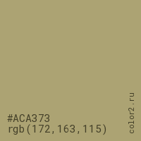 Цвет #ACA373 в цветовой модели RGB обозначается тремя октетами (172, 163, 115) в десятичном формате и #ACA373 в шестнадцатиричном (hex) формате, которые являются интенсивностью красного 172 (hex AC), интенсивность зелёного 163 (hex A3) и интенсивность синего 115 (hex 73).