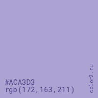 Цвет #ACA3D3 в цветовой модели RGB обозначается тремя октетами (172, 163, 211) в десятичном формате и #ACA3D3 в шестнадцатиричном (hex) формате, которые являются интенсивностью красного 172 (hex AC), интенсивность зелёного 163 (hex A3) и интенсивность синего 211 (hex D3).