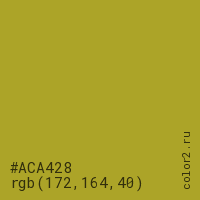 Цвет #ACA428 в цветовой модели RGB обозначается тремя октетами (172, 164, 40) в десятичном формате и #ACA428 в шестнадцатиричном (hex) формате, которые являются интенсивностью красного 172 (hex AC), интенсивность зелёного 164 (hex A4) и интенсивность синего 40 (hex 28).