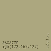Цвет #ACA77F в цветовой модели RGB обозначается тремя октетами (172, 167, 127) в десятичном формате и #ACA77F в шестнадцатиричном (hex) формате, которые являются интенсивностью красного 172 (hex AC), интенсивность зелёного 167 (hex A7) и интенсивность синего 127 (hex 7F).