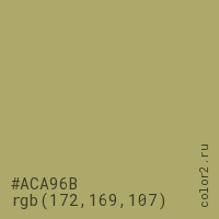Цвет #ACA96B в цветовой модели RGB обозначается тремя октетами (172, 169, 107) в десятичном формате и #ACA96B в шестнадцатиричном (hex) формате, которые являются интенсивностью красного 172 (hex AC), интенсивность зелёного 169 (hex A9) и интенсивность синего 107 (hex 6B).