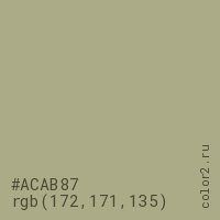 Цвет #ACAB87 в цветовой модели RGB обозначается тремя октетами (172, 171, 135) в десятичном формате и #ACAB87 в шестнадцатиричном (hex) формате, которые являются интенсивностью красного 172 (hex AC), интенсивность зелёного 171 (hex AB) и интенсивность синего 135 (hex 87).