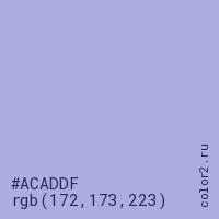 Цвет #ACADDF в цветовой модели RGB обозначается тремя октетами (172, 173, 223) в десятичном формате и #ACADDF в шестнадцатиричном (hex) формате, которые являются интенсивностью красного 172 (hex AC), интенсивность зелёного 173 (hex AD) и интенсивность синего 223 (hex DF).