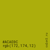 Цвет #ACAE0C в цветовой модели RGB обозначается тремя октетами (172, 174, 12) в десятичном формате и #ACAE0C в шестнадцатиричном (hex) формате, которые являются интенсивностью красного 172 (hex AC), интенсивность зелёного 174 (hex AE) и интенсивность синего 12 (hex 0C).
