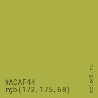 Цвет #ACAF44 в цветовой модели RGB обозначается тремя октетами (172, 175, 68) в десятичном формате и #ACAF44 в шестнадцатиричном (hex) формате, которые являются интенсивностью красного 172 (hex AC), интенсивность зелёного 175 (hex AF) и интенсивность синего 68 (hex 44).