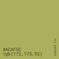 Цвет #ACAF5C в цветовой модели RGB обозначается тремя октетами (172, 175, 92) в десятичном формате и #ACAF5C в шестнадцатиричном (hex) формате, которые являются интенсивностью красного 172 (hex AC), интенсивность зелёного 175 (hex AF) и интенсивность синего 92 (hex 5C).