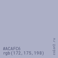 Цвет #ACAFC6 в цветовой модели RGB обозначается тремя октетами (172, 175, 198) в десятичном формате и #ACAFC6 в шестнадцатиричном (hex) формате, которые являются интенсивностью красного 172 (hex AC), интенсивность зелёного 175 (hex AF) и интенсивность синего 198 (hex C6).