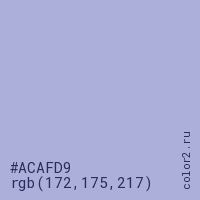 Цвет #ACAFD9 в цветовой модели RGB обозначается тремя октетами (172, 175, 217) в десятичном формате и #ACAFD9 в шестнадцатиричном (hex) формате, которые являются интенсивностью красного 172 (hex AC), интенсивность зелёного 175 (hex AF) и интенсивность синего 217 (hex D9).