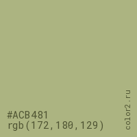 Цвет #ACB481 в цветовой модели RGB обозначается тремя октетами (172, 180, 129) в десятичном формате и #ACB481 в шестнадцатиричном (hex) формате, которые являются интенсивностью красного 172 (hex AC), интенсивность зелёного 180 (hex B4) и интенсивность синего 129 (hex 81).