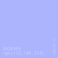 Цвет #ACB4FE в цветовой модели RGB обозначается тремя октетами (172, 180, 254) в десятичном формате и #ACB4FE в шестнадцатиричном (hex) формате, которые являются интенсивностью красного 172 (hex AC), интенсивность зелёного 180 (hex B4) и интенсивность синего 254 (hex FE).
