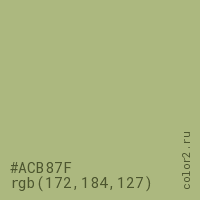 Цвет #ACB87F в цветовой модели RGB обозначается тремя октетами (172, 184, 127) в десятичном формате и #ACB87F в шестнадцатиричном (hex) формате, которые являются интенсивностью красного 172 (hex AC), интенсивность зелёного 184 (hex B8) и интенсивность синего 127 (hex 7F).