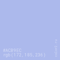 Цвет #ACB9EC в цветовой модели RGB обозначается тремя октетами (172, 185, 236) в десятичном формате и #ACB9EC в шестнадцатиричном (hex) формате, которые являются интенсивностью красного 172 (hex AC), интенсивность зелёного 185 (hex B9) и интенсивность синего 236 (hex EC).