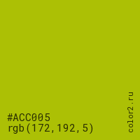 Цвет #ACC005 в цветовой модели RGB обозначается тремя октетами (172, 192, 5) в десятичном формате и #ACC005 в шестнадцатиричном (hex) формате, которые являются интенсивностью красного 172 (hex AC), интенсивность зелёного 192 (hex C0) и интенсивность синего 5 (hex 05).