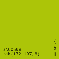 Цвет #ACC508 в цветовой модели RGB обозначается тремя октетами (172, 197, 8) в десятичном формате и #ACC508 в шестнадцатиричном (hex) формате, которые являются интенсивностью красного 172 (hex AC), интенсивность зелёного 197 (hex C5) и интенсивность синего 8 (hex 08).