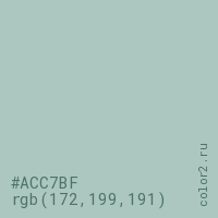 Цвет #ACC7BF в цветовой модели RGB обозначается тремя октетами (172, 199, 191) в десятичном формате и #ACC7BF в шестнадцатиричном (hex) формате, которые являются интенсивностью красного 172 (hex AC), интенсивность зелёного 199 (hex C7) и интенсивность синего 191 (hex BF).