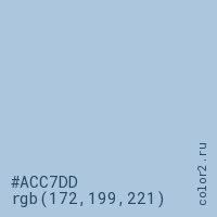 Цвет #ACC7DD в цветовой модели RGB обозначается тремя октетами (172, 199, 221) в десятичном формате и #ACC7DD в шестнадцатиричном (hex) формате, которые являются интенсивностью красного 172 (hex AC), интенсивность зелёного 199 (hex C7) и интенсивность синего 221 (hex DD).
