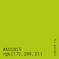 Цвет #ACC815 в цветовой модели RGB обозначается тремя октетами (172, 200, 21) в десятичном формате и #ACC815 в шестнадцатиричном (hex) формате, которые являются интенсивностью красного 172 (hex AC), интенсивность зелёного 200 (hex C8) и интенсивность синего 21 (hex 15).
