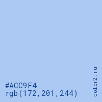 Цвет #ACC9F4 в цветовой модели RGB обозначается тремя октетами (172, 201, 244) в десятичном формате и #ACC9F4 в шестнадцатиричном (hex) формате, которые являются интенсивностью красного 172 (hex AC), интенсивность зелёного 201 (hex C9) и интенсивность синего 244 (hex F4).