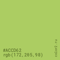 Цвет #ACCD62 в цветовой модели RGB обозначается тремя октетами (172, 205, 98) в десятичном формате и #ACCD62 в шестнадцатиричном (hex) формате, которые являются интенсивностью красного 172 (hex AC), интенсивность зелёного 205 (hex CD) и интенсивность синего 98 (hex 62).