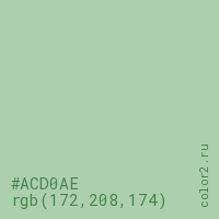 Цвет #ACD0AE в цветовой модели RGB обозначается тремя октетами (172, 208, 174) в десятичном формате и #ACD0AE в шестнадцатиричном (hex) формате, которые являются интенсивностью красного 172 (hex AC), интенсивность зелёного 208 (hex D0) и интенсивность синего 174 (hex AE).