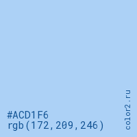 Цвет #ACD1F6 в цветовой модели RGB обозначается тремя октетами (172, 209, 246) в десятичном формате и #ACD1F6 в шестнадцатиричном (hex) формате, которые являются интенсивностью красного 172 (hex AC), интенсивность зелёного 209 (hex D1) и интенсивность синего 246 (hex F6).